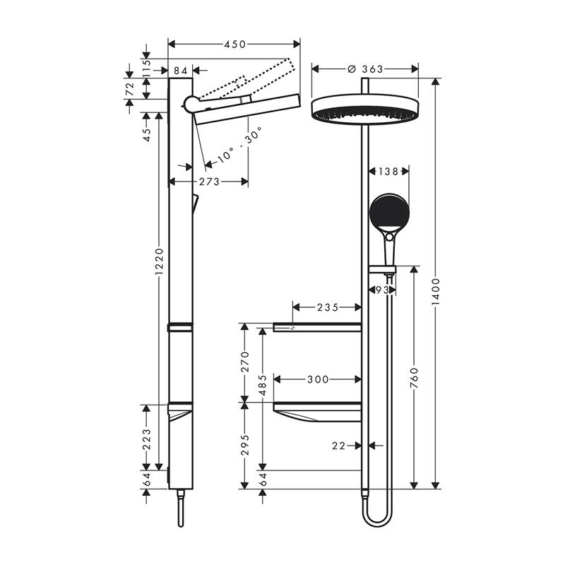 • şunları içerir:: tepe duşu, el duşu, duş askısı, duş hortumu, 2 cam raf, duş barı