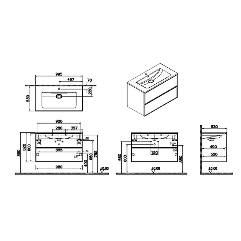 Vitra Metropole Edge Lavabo Dolabı 100 Cm, İki Çekmeceli Etajerli Lavabolu, Açık Meşe (67137)
