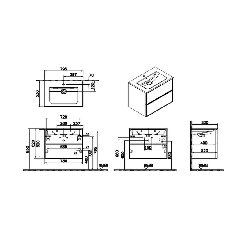 Vitra Metropole Edge Lavabo Dolabı 80 Cm, İki Çekmeceli Etajerli Lavabolu, Açık Meşe (67136)